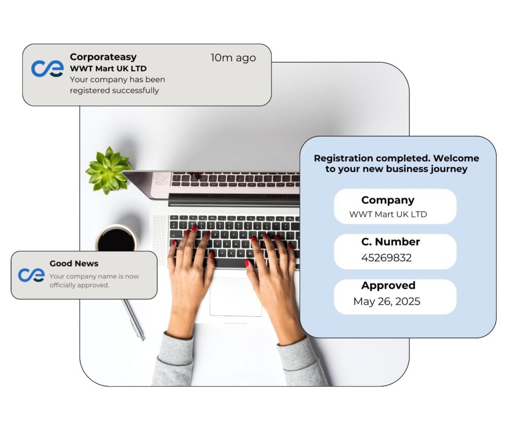 Once your application is completed, we will set up your company within 3-6 working hours, depending on companies house workload on the day. You will receive a notification telling you that your application has been approved. Digital copies of your company documents in PDF format will be sent to your email address. Once this is completed, you can immediately begin trading with your company.